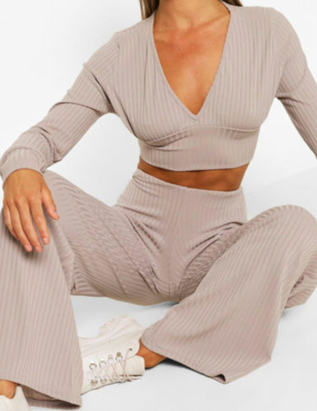 Grått ribbat set med croppad topp och byxor från Boohoo. ANNONS Här kan du köpa setet.