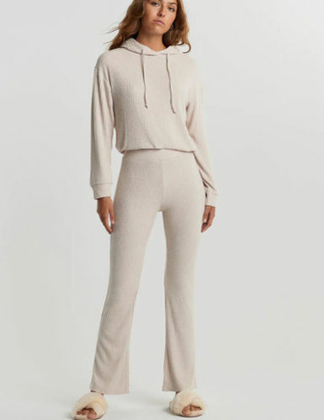 Ljusbeige set i ribbat material från H&M. ANNONS Här kan du köpa toppen. ANNONS Här kan du köpa tröjan. ANNONS Här kan du köpa byxorna.