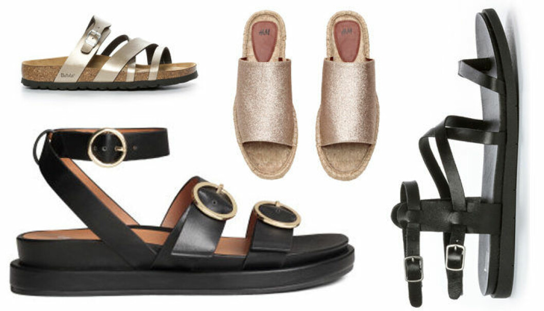Guldiga remtofflor 599 kr, Betula/Nilson shoes, svarta sandaler med grov sula 249 kr, H&M, espadrilltofflor 249 kr, H&M och remsandaler 499 kr, Din Sko.
